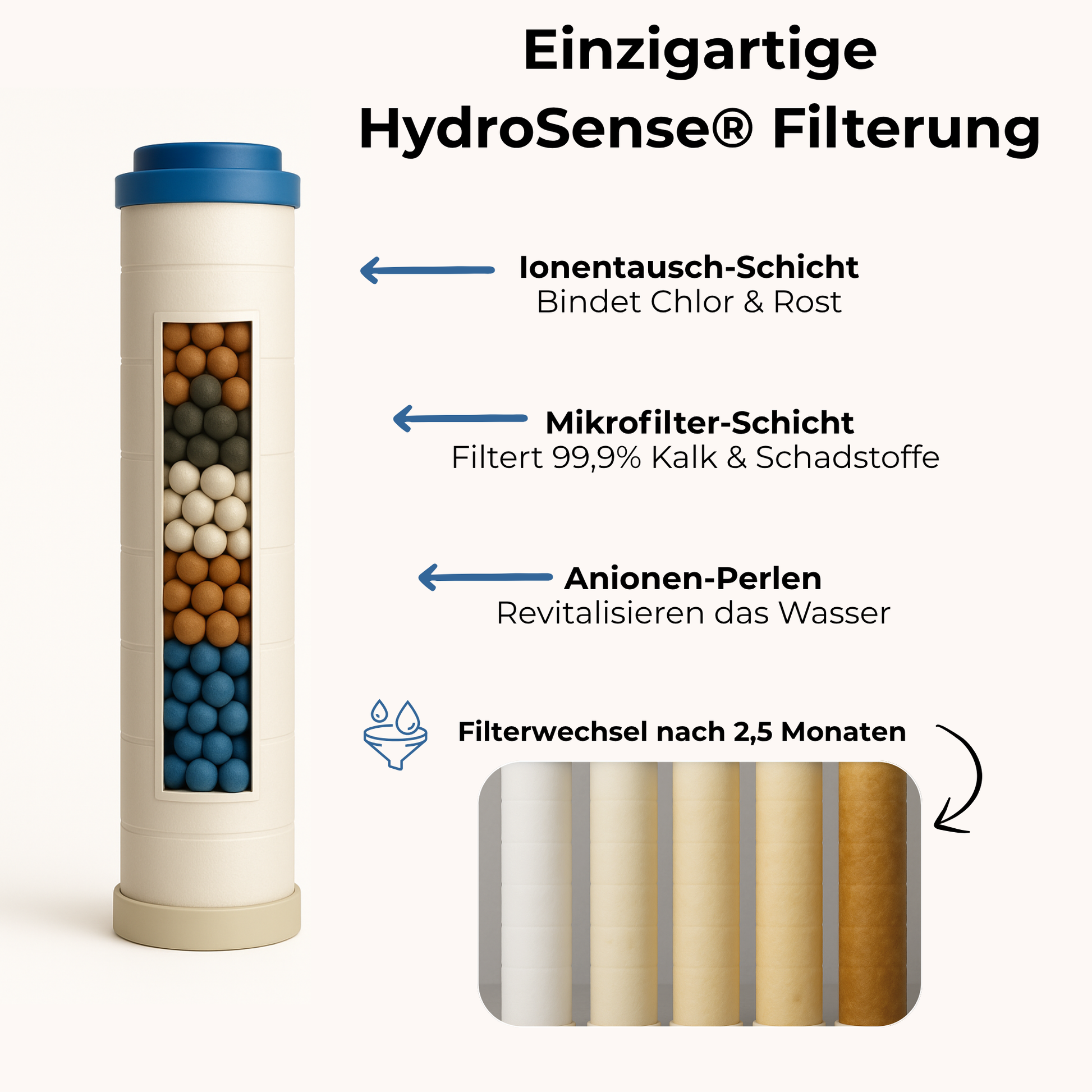 Leitungswasser enthält Chlor, Kalk und Rückstände. Unbedenklich zu trinken, aber belastend für Haut und Haar. Der VitaShower® filtert bis zu 99,9 % dieser Stoffe heraus. Spürbar weichere Haut und kräftigeres Haar ab der ersten Dusche, ganz ohne neue Pflegeprodukte.